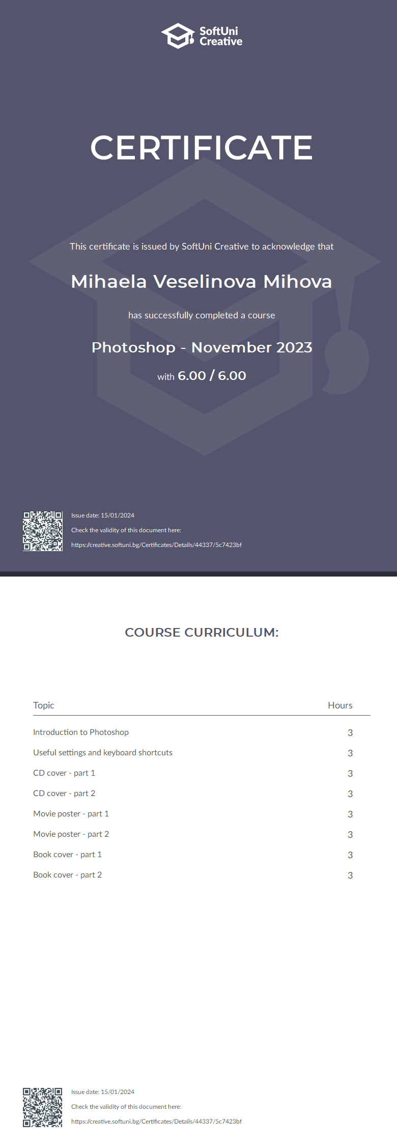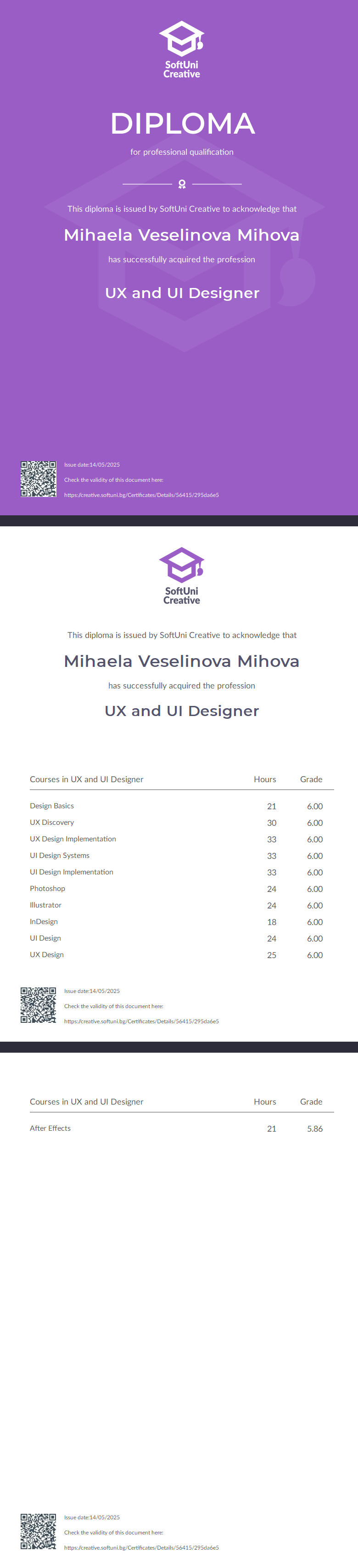 Art and design have always been a part of my life in one way or another. I studied Fashion Design in high school and university, fully convinced I’d be the next big name in the industry… until I realised I preferred designing for fun rather than as a career. That led me to graphic design, where I dove into the SoftUni program. A few courses and certificates later, here I am, turning that passion into reality.